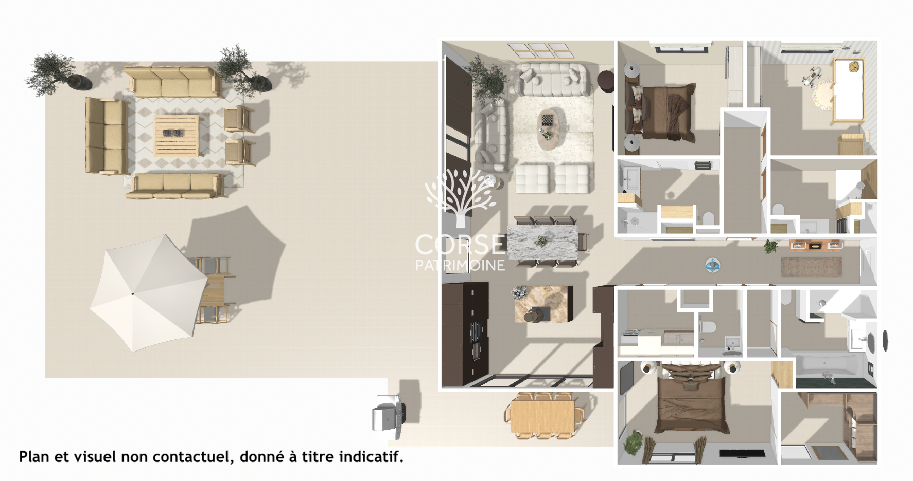 Véritable bien d’exception, cette villa sur le toit développe une superficie d’environ 138 m2. Elle propose un spacieux séjour baigné de lumière avec cuisine ouverte, s’ouvrant sur une magnifique terrasse de 148 m2 exposée Ouest, offrant un espace de vie extérieur rare et idéal pour profiter des fins de journée et des couchers de soleil.