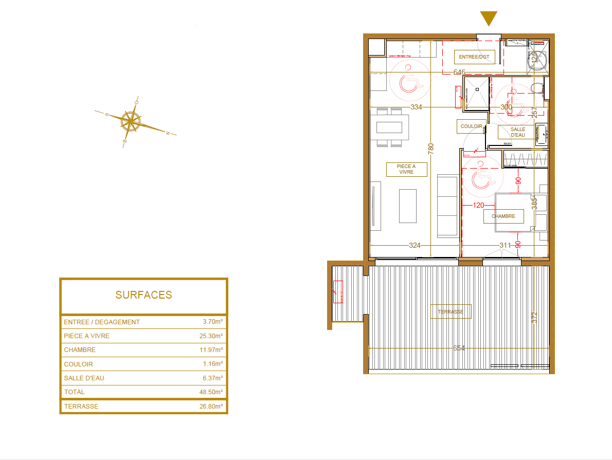 D’une superficie généreuse de 48.52 m2, ce bien se compose d’une pièce de vie lumineuse ouvrant sur une terrasse de 26.8 m2 avec vue mer, une chambre, ainsi que d’une salle d’eau avec WC.