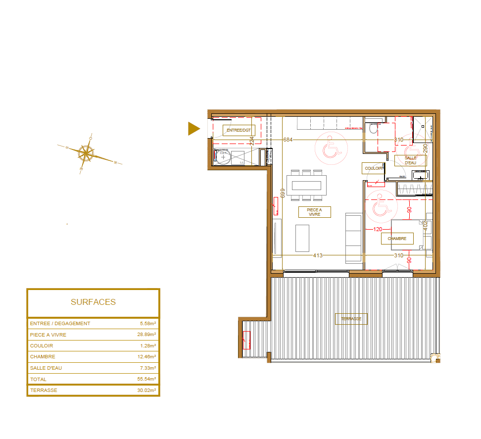 D’une superficie généreuse de 55.65 m2, ce bien se compose d’une pièce de vie lumineuse ouvrant sur une terrasse de 30.02 m2 avec vue mer, une chambre, ainsi que d’une salle d’eau avec WC.