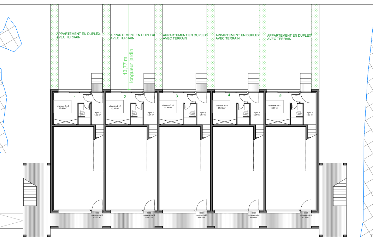 Nous vous proposons un appartement T3 en duplex d’une superficie de 62,36 m2. Réparti sur deux niveaux, il se compose à l’étage d’une entrée avec une pièce de vie de 28,36 m2, d’une chambre de 10,86 m2, d’une salle d’eau avec WC de 4,74 m2, ainsi que d’une terrasse de 21,66 m2. Au rez-de-chaussée, vous trouverez une chambre supplémentaire avec sa propre salle d’eau et WC, d’une surface de 13,20 m2. L’appartement dispose également d’un jardin privatif de 77,80 m2 en jouissance exclusive.