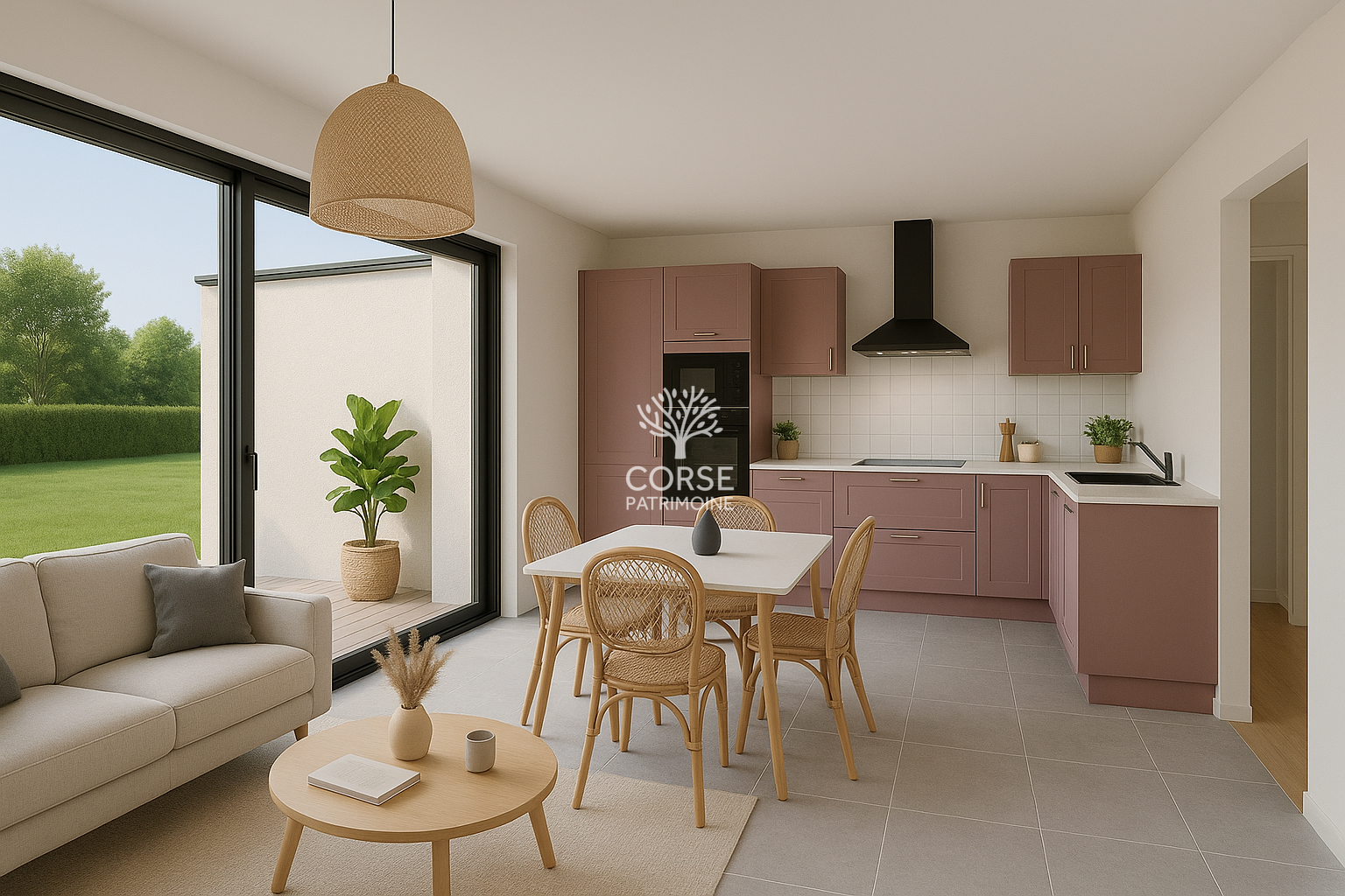 La pièce de vie lumineuse, avec une cuisine ouverte aménagée, crée un espace convivial.