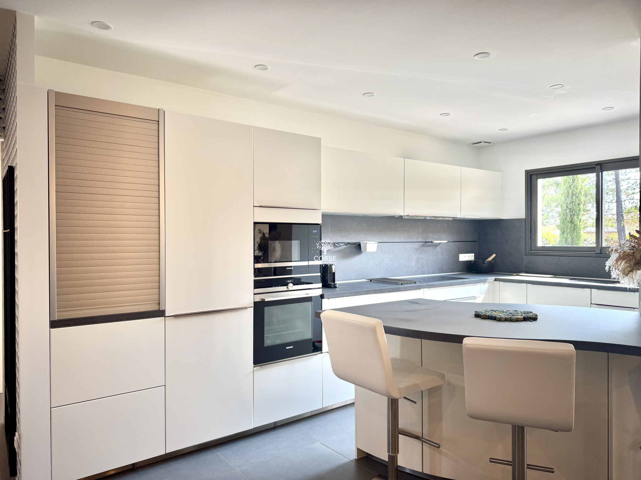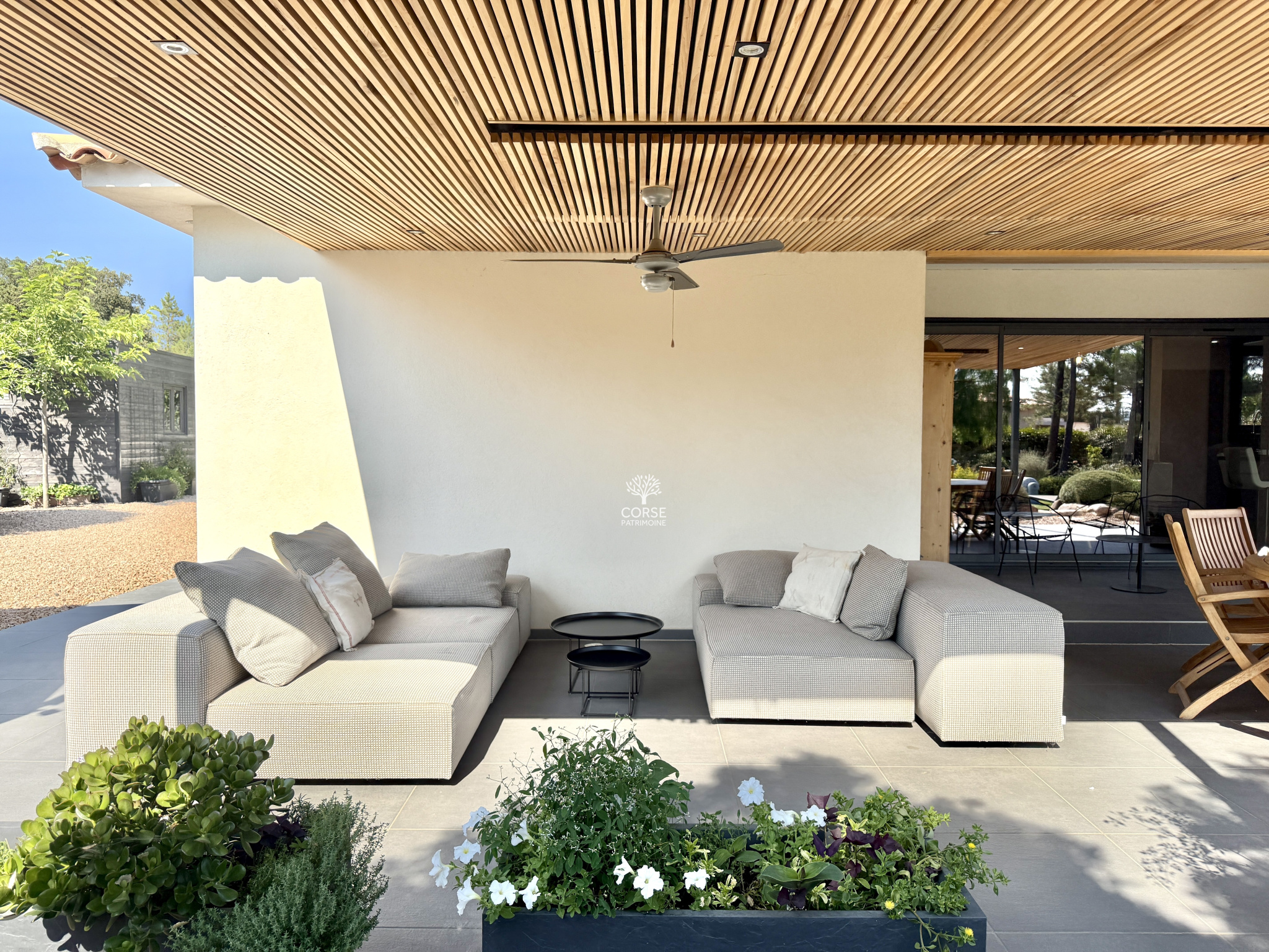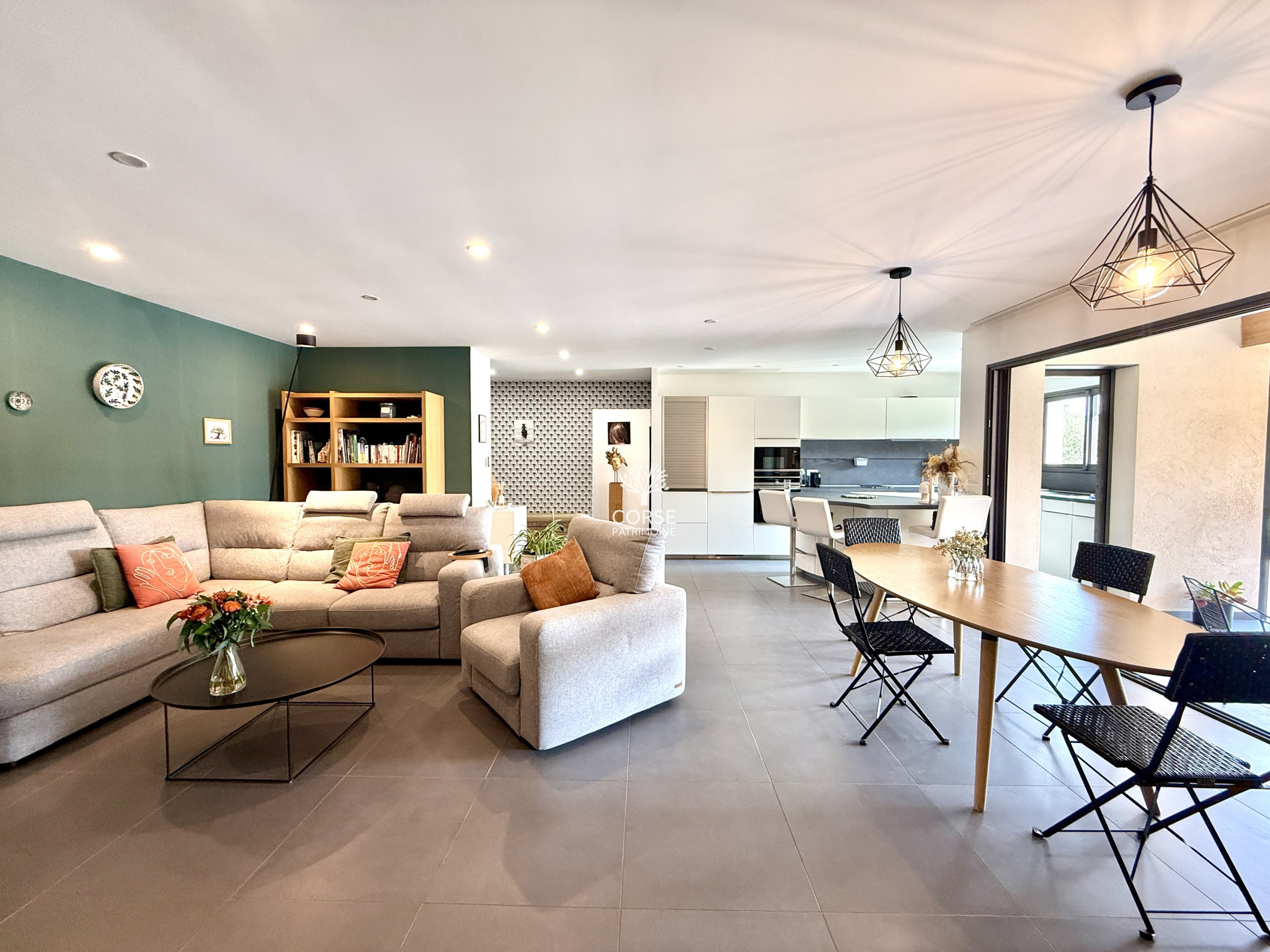 D’une surface habitable généreuse, elle offre une magnifique pièce de vie lumineuse de plus de 50 m2. La cuisine ouverte s’intègre parfaitement à cet espace chaleureux, donnant directement sur une grande terrasse, dont une partie est couverte grâce à une pergola moderne.