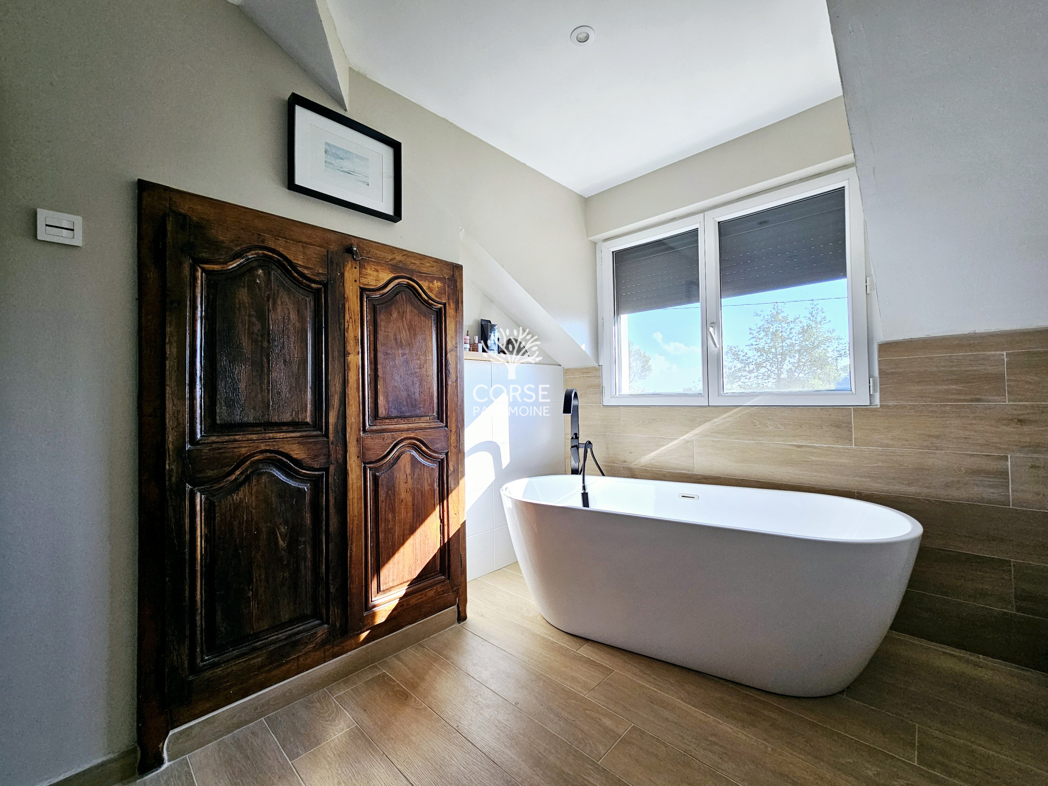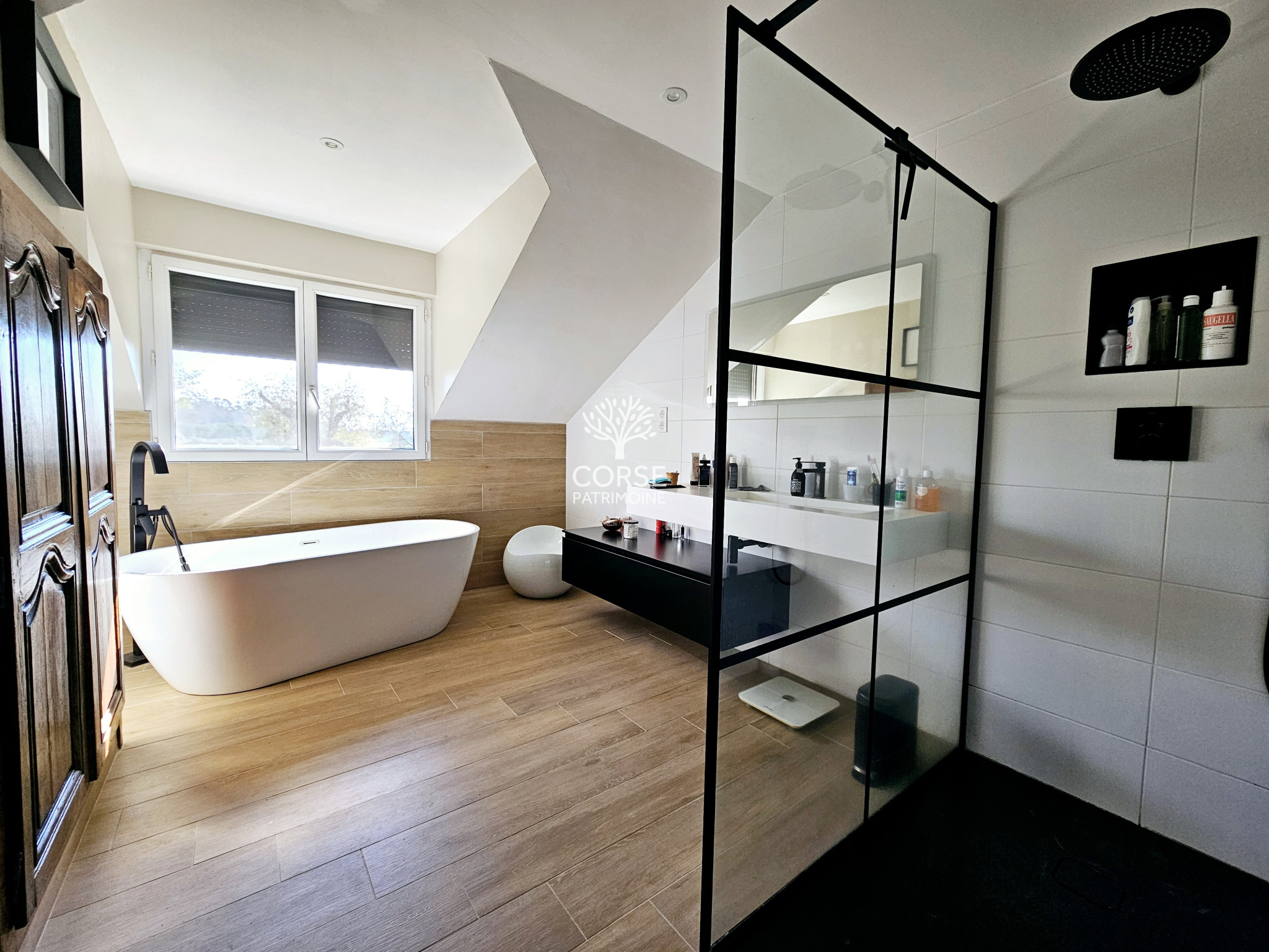 À l’étage, trois belles chambres vous attendent, dont une avec dressing, tandis que les deux autres disposent de placards intégrés. La salle de bain allie modernité et confort, avec une douche à l’italienne et une baignoire îlot. Un WC suspendu indépendant complète ce niveau.