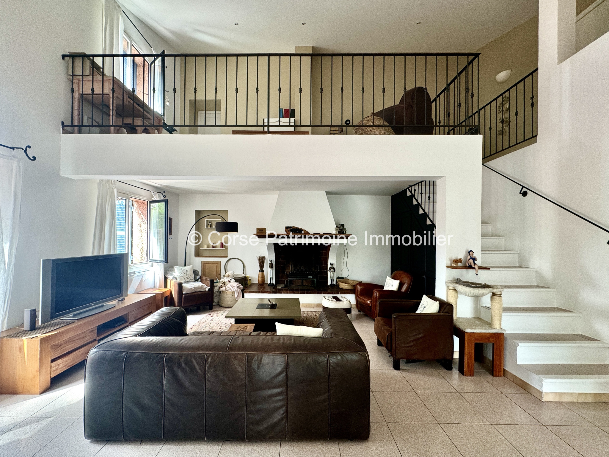 La partie principale, d’une superficie d’environ 160 m2, s’ouvre sur un vaste séjour avec cheminée, prolongé par une salle à manger donnant accès à une terrasse couverte. La cuisine séparée permet plus d’intimité. Une chambre avec salle d’eau se situe au rez-de-chaussée, tandis qu’une seconde chambre en mezzanine avec sa salle d’eau complète l’espace de nuit. Le grenier offre également une possibilité d’aménagement supplémentaire.