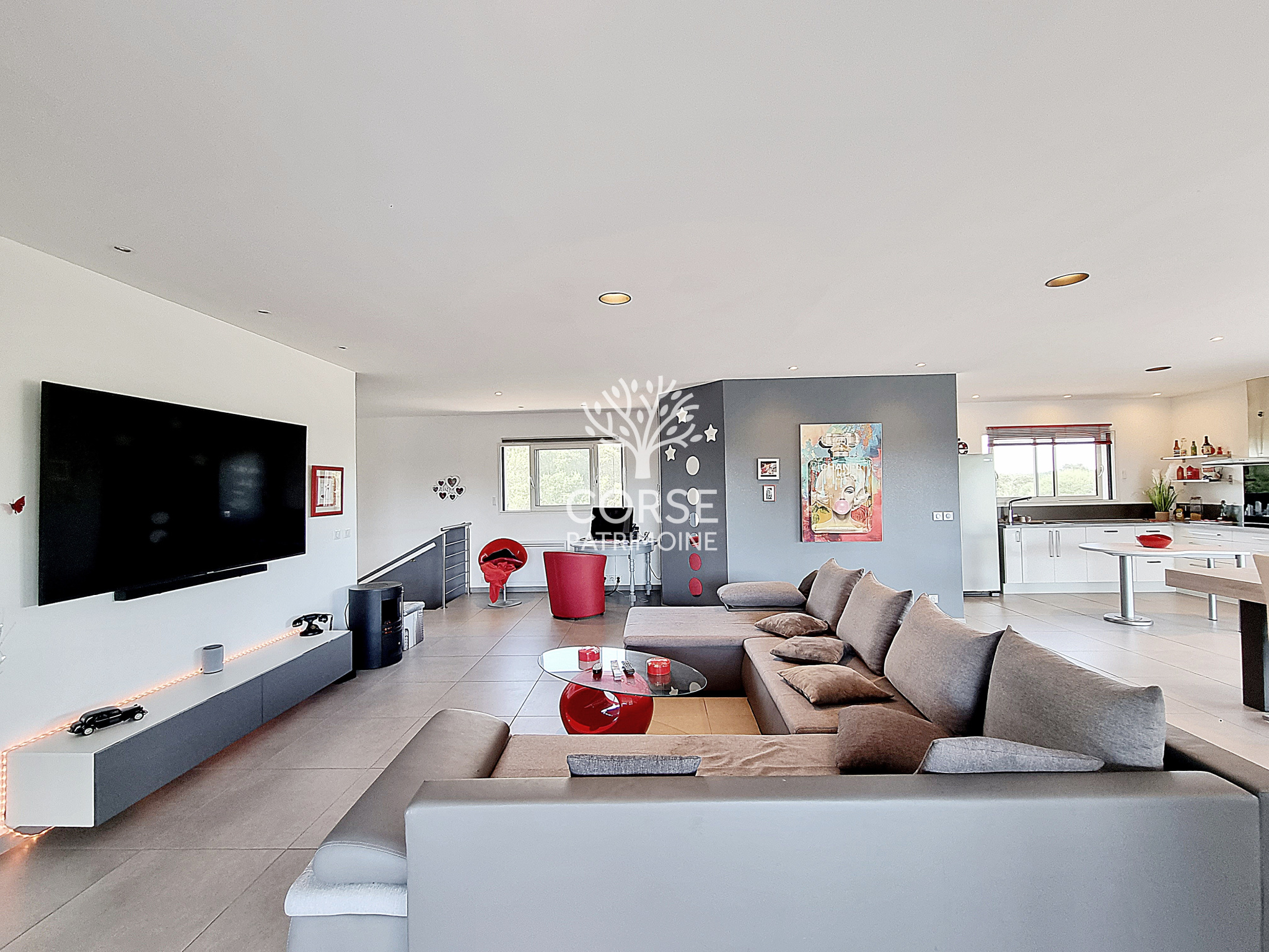 Au niveau supérieur, nous pouvons découvrir une vaste et lumineuse pièce de vie disposant de grandes baies vitrées à galandage avec cuisine ouverte équipée et aménagée ouvrant sur une spacieuse terrasse en partie couverte, de 80 m2 entourant la pièce avec une vue sur la mer.
