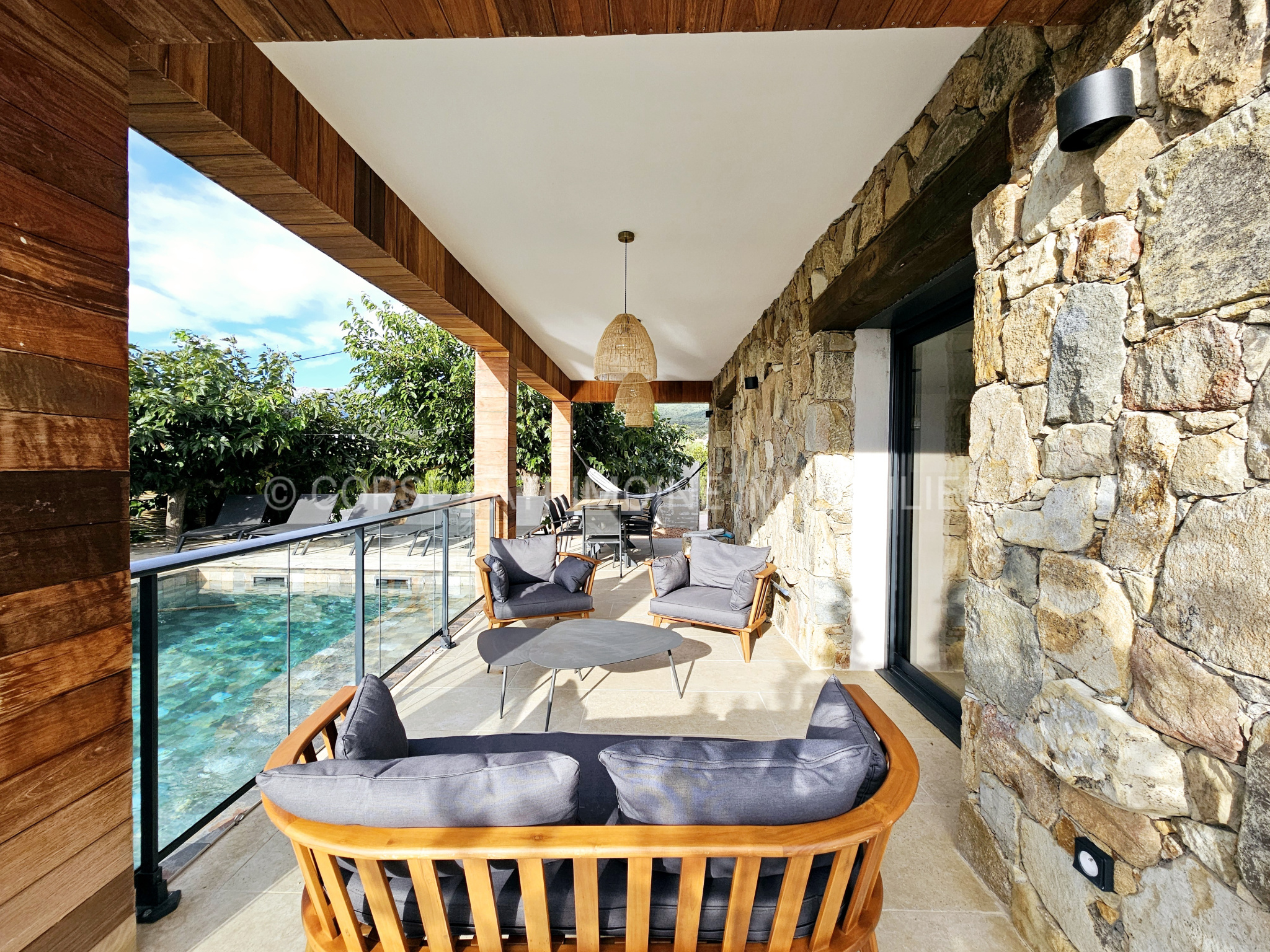 Nichée à quelques minutes des plages paradisiaques de la Corse-du-Sud, découvrez cette somptueuse bergerie avec des matériaux de qualité, offrant une harmonie entre un caractère authentique et un design contemporain. Surplombant la mer, cette propriété d’exception vous offre un environnement de vie privilégié où calme et sérénité sont maîtres mots, tout en restant à proximité des commodités locales et des rivières environnantes. Dès l’entrée, vous serez séduit par l’atmosphère chaleureuse de cette demeure. La pièce à vivre lumineuse, comprenant une cuisine ouverte, aménagée et équipée avec des finitions haut de gamme. La bergerie dispose de trois suites, chacune avec sa salle d’eau ou salle de bains privative, offrant confort et intimité à tous ses occupants. Les chambres bénéficient de placards sur mesure. À l’extérieur, une piscine chauffée avec traitement au sel vous attend, avec une vue imprenable sur la mer. Le jardin est enrichi par une sélection de plantes soigneusement choisies, avec un système de goutte-à-goutte mis en place pour faciliter l’entretien. Un espace barbecue, un boulodrome, ainsi qu’une borne de recharge pour véhicule électrique viennent compléter cet ensemble. Côté équipements, rien n’a été laissé au hasard : climatisation réversible dans chaque pièce, menuiseries en aluminium avec galandage, portail électrique, et système d’alarme assurant votre tranquillité. Ce bien rare sur le marché combine charme et fonctionnalité pour une expérience de vie unique. Ne manquez pas cette occasion exceptionnelle d’acquérir un bien d’exception dans un cadre naturel préservé, à deux pas des plages. La bergerie est vendue entièrement meublée et équipée.