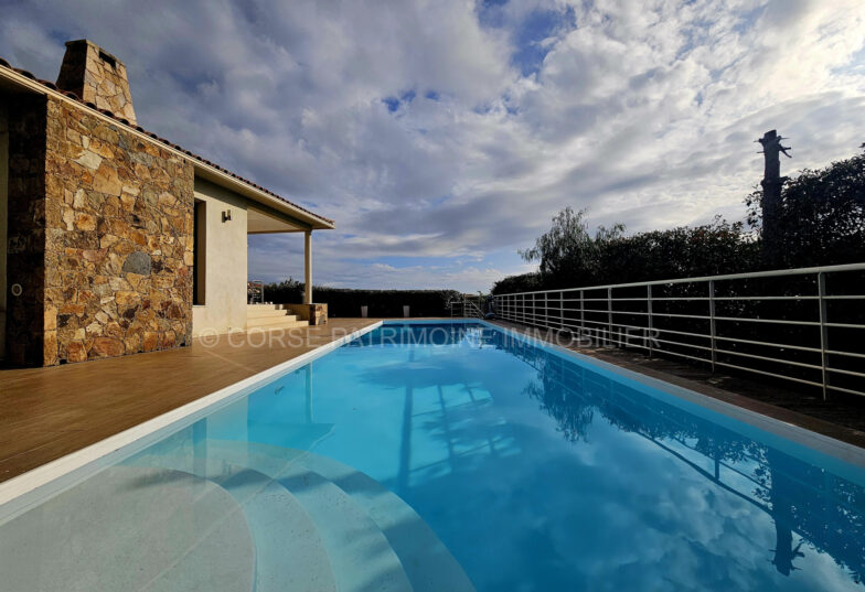 Vente Villa Aleria REF:2812 Nichée dans un environnement privilégié à Aléria, cette élégante villa de plain-pied de type 4 offre 95 m2 de confort moderne.Sa pièce de vie baignée de lumière, agrémentée par un poêle à bois, s’ouvre sur une cuisine contemporaine entièrement aménagée et équipée.L’ensemble donne accès à une vaste terrasse couverte de 30 […]